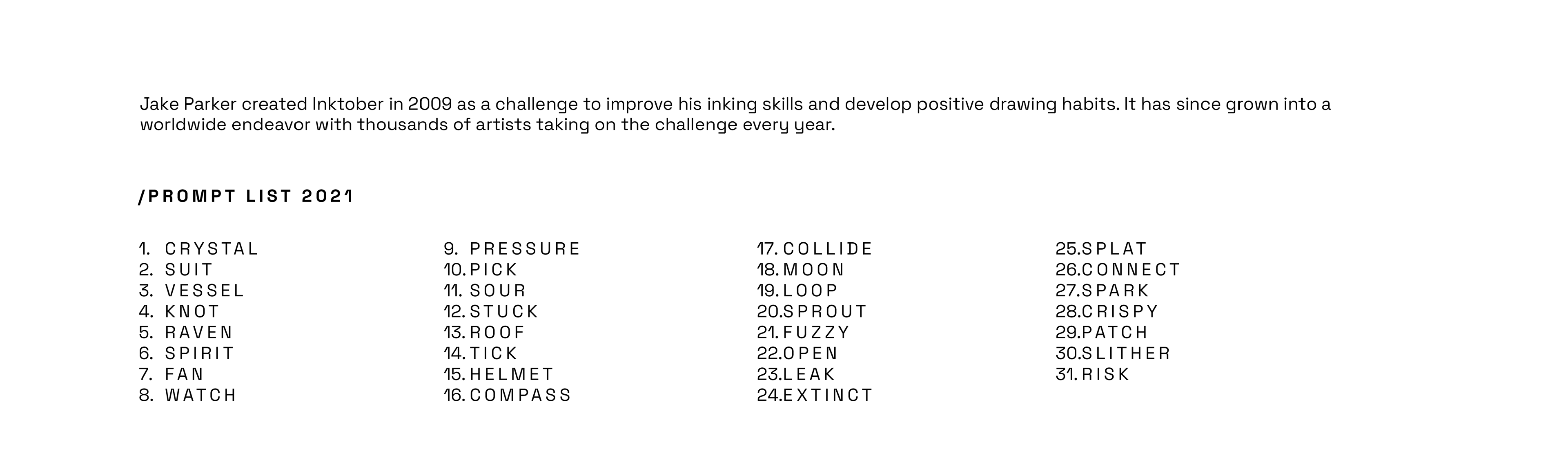 Inktober es un proyecto para aficionados y profesionales de la ilustración basado en la creación diaria durante el mes de octubre de una obra original siguiendo la lista oficial creada por Jake Parker.